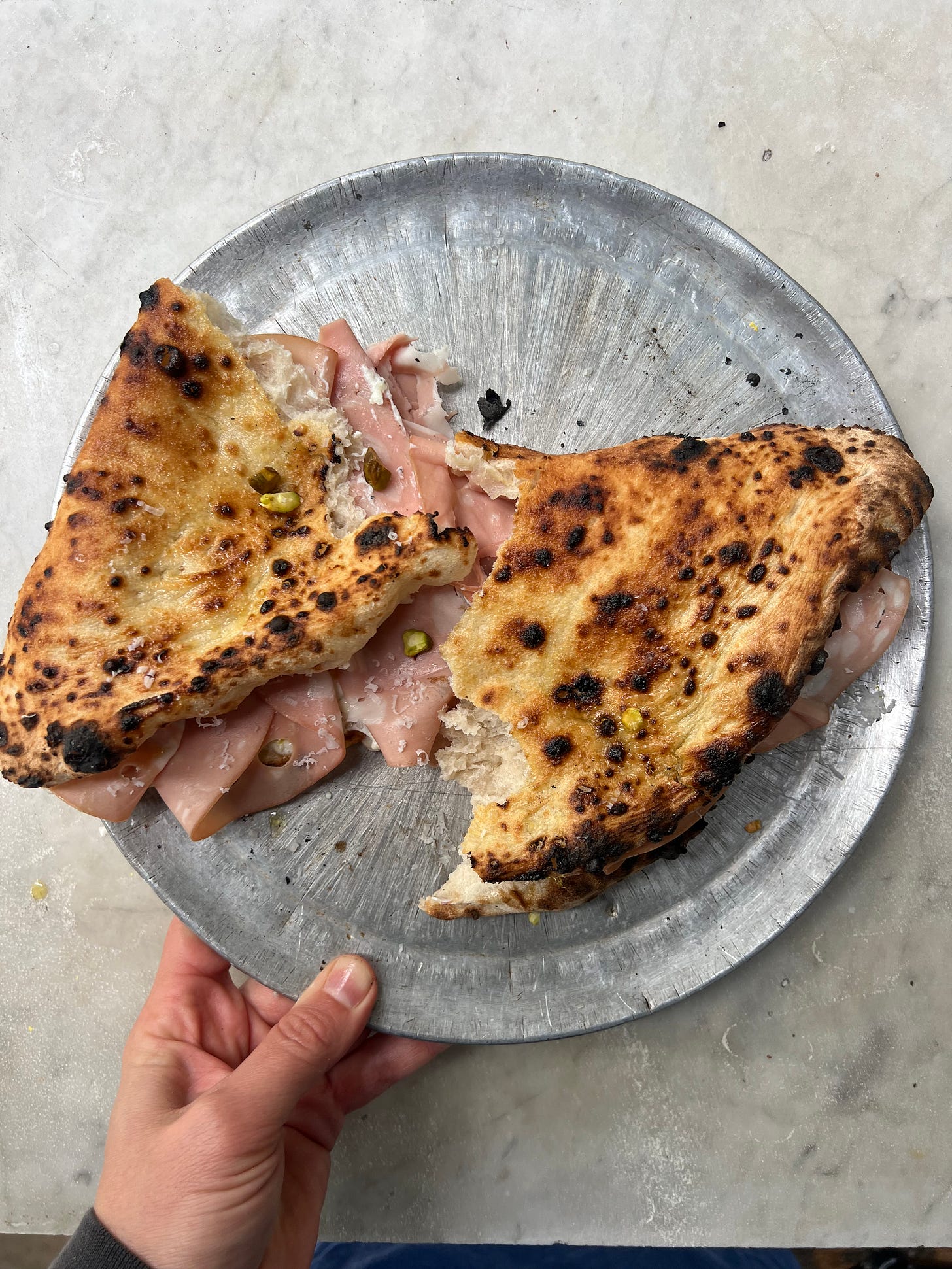 Carefully open the pocket. Fill with ricotta, pistachios, lemon zest, fennel pollen, and mortadella in loose folds.