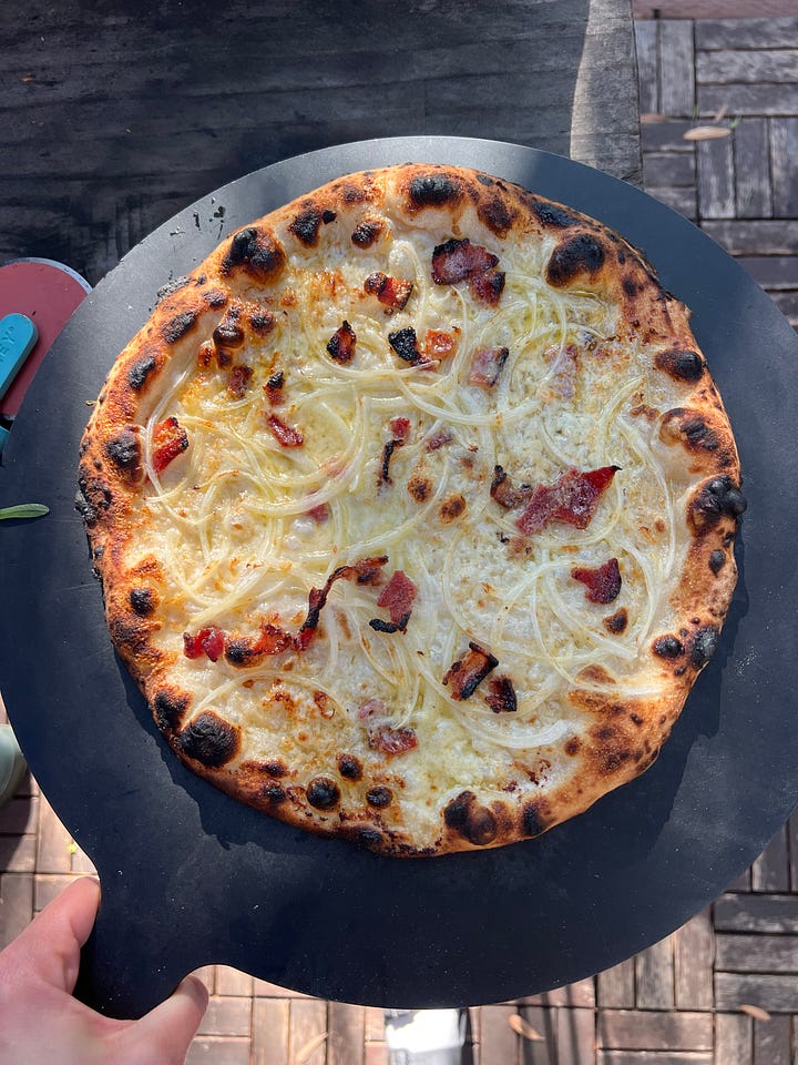 David was nostalgic for Lawry’s Steak House in Los Angeles. The spinning bowl on ice, the dramatic dressing pour, and the tableside mix. LA has so many iconic spots like this that I would honestly visit just for the theater. We had some fun trying to recreate the salad.Gozney Tarte flambée with frisée salad.