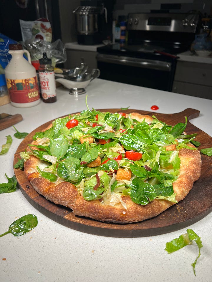 Aydan was inspired by the diner-style Greek salads that appeared on nearly every pizzeria menu in his hometown on Long Island. His New York–style dough is no joke. Crispy, chewy, and perfectly baked in a regular home oven!Outside Pizza Cheese and garlic pizza with a miso Caesar salad.